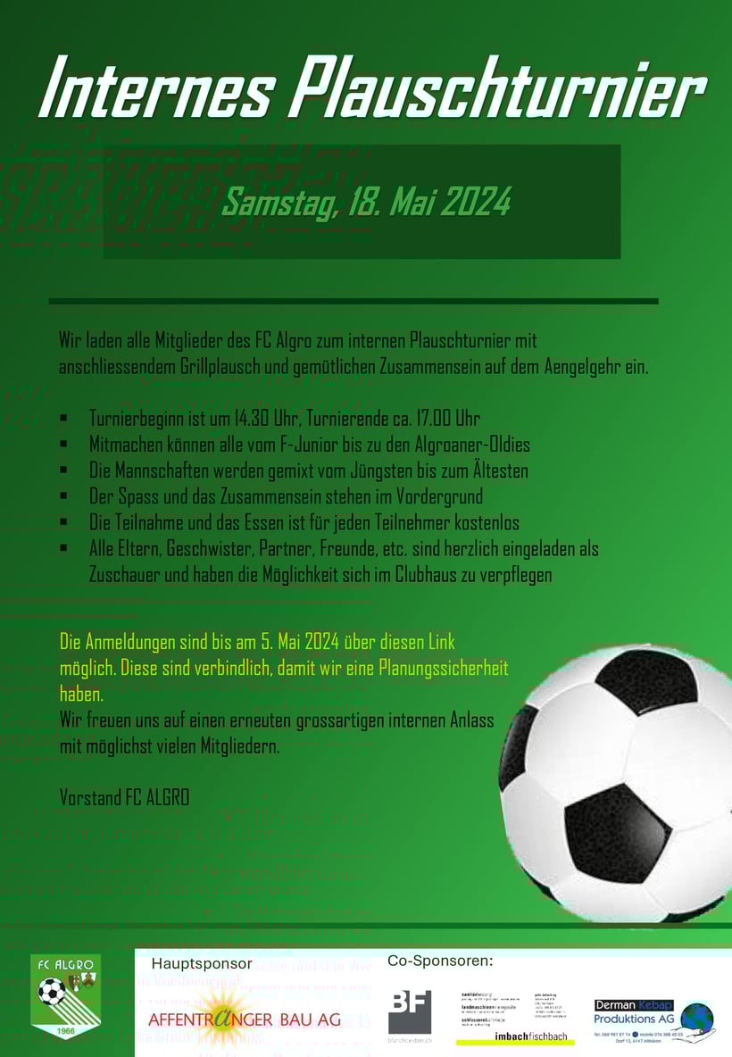 Wir laden alle Mitglieder des FC Algro zum zweiten internen Plauschturnier mit anschliessendem Grillplausch und gemütlichen Zusammensein auf dem Aengelgehr ein.